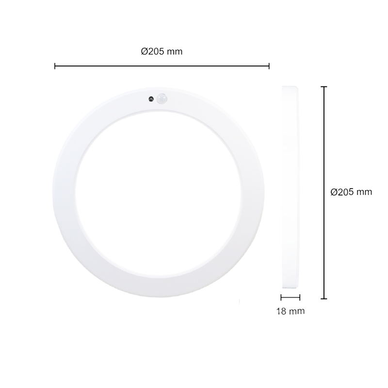 Dankzij het slanke ontwerp (18 mm hoog) en de vaste zaagmaat van Ø205 mm is installatie eenvoudig in systeemplafonds of op vlakke oppervlakken. De armatuur wordt geleverd met ophangbeugel, schroeven en handleiding.