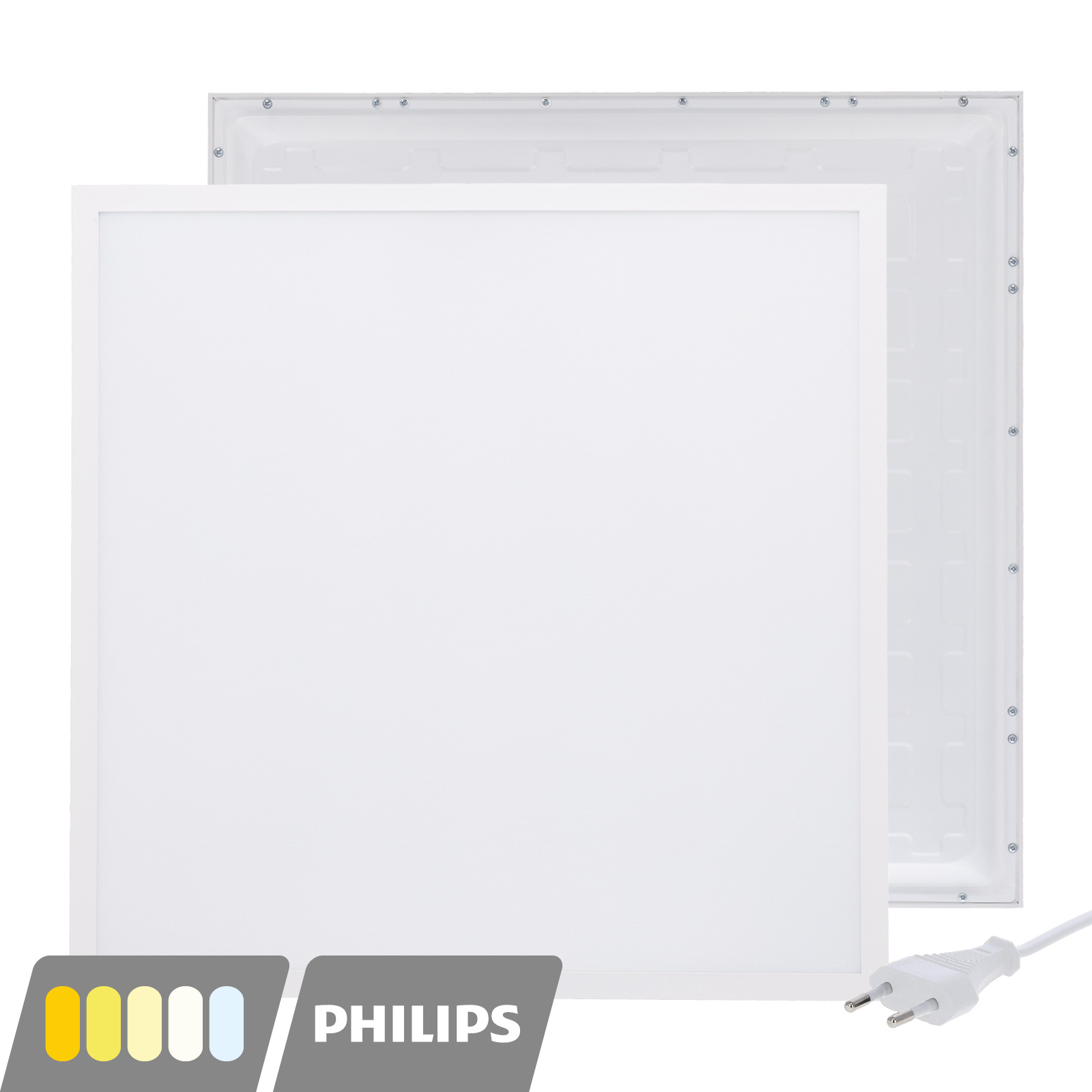 Het Europa LED paneel beschikt over een CCT-schakeling waarmee u de kleurtemperatuur eenvoudig instelt op 3000K (warm wit), 3500K (warm-neutraal wit), 4000K (neutraal wit), 5000K (helder wit) of 6000K (koel wit). Zo past u de verlichting naadloos aan op het type ruimte of het gewenste sfeerbeeld, van vergaderruimte tot showroom.