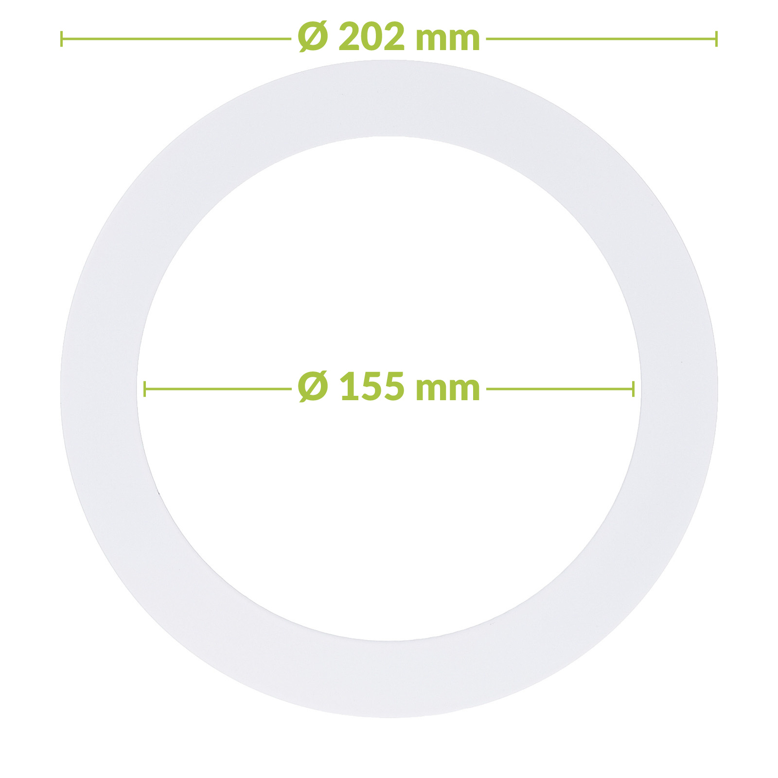 Met een binnenmaat van Ø155 mm en een buitenmaat van Ø202 mm is deze verloopring bedoeld om grotere openingen passend af te werken voor downlighters met een kleinere inbouwmaat. Door de slanke uitvoering blijft het geheel subtiel in beeld, terwijl u wel profiteert van een nette, duurzame en functionele afwerking.