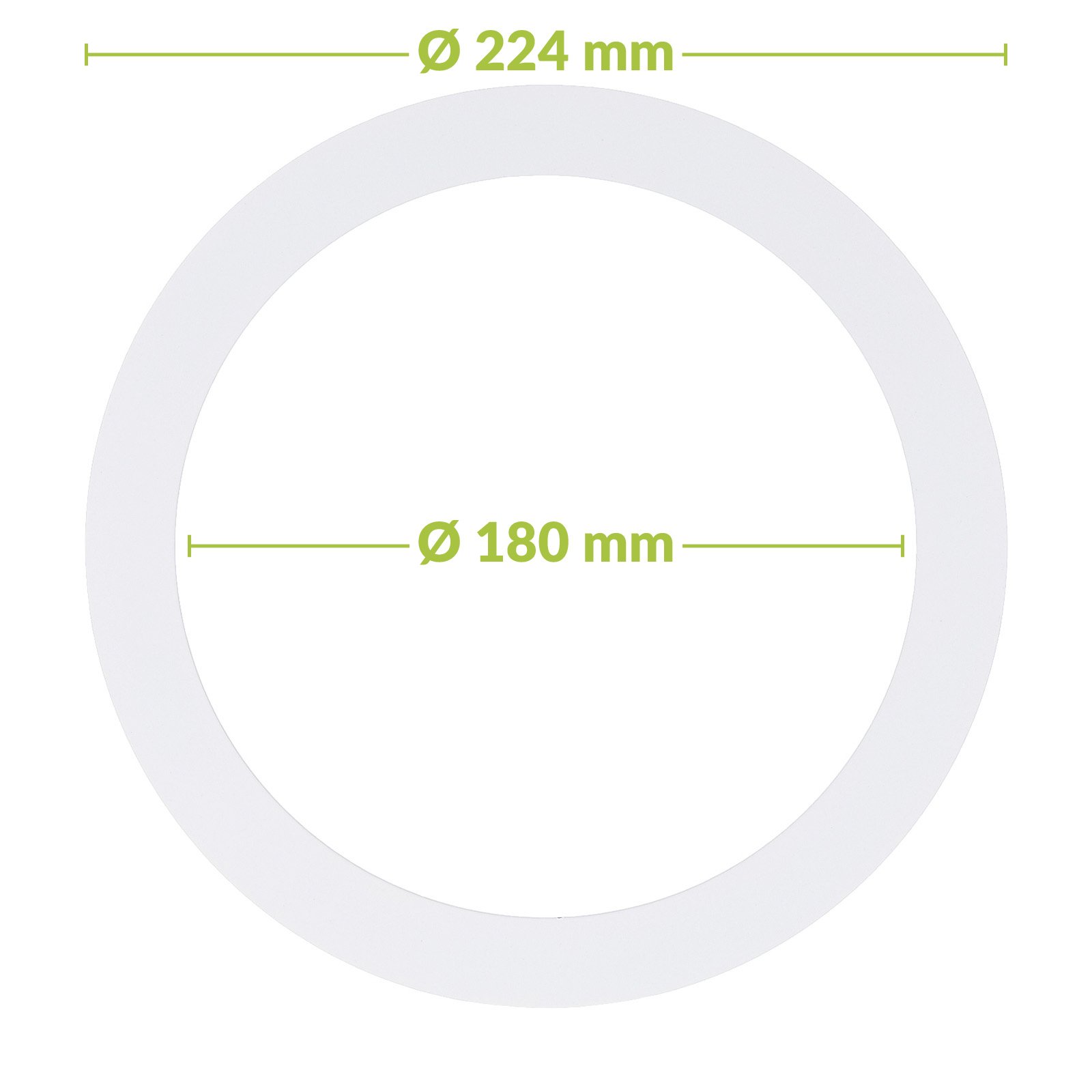 Met een binnenmaat van Ø180 mm en een buitenmaat van Ø224 mm is deze verloopring ontworpen voor situaties waarin een grotere opening netjes moet worden overbrugd. De slanke dikte van 0,8 mm draagt bij aan een subtiele afwerking, terwijl het metaal zorgt voor stabiliteit en een verzorgde montage van de inbouwverlichting.