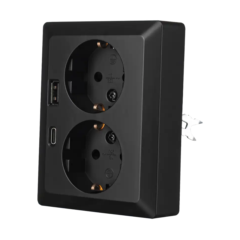 Dankzij de IP20-classificatie is de contactdoos veilig te gebruiken in droge binnenruimtes. De mat zwarte afwerking (RAL9017) zorgt voor een moderne en stijlvolle uitstraling die uitstekend aansluit bij hedendaagse interieurs.